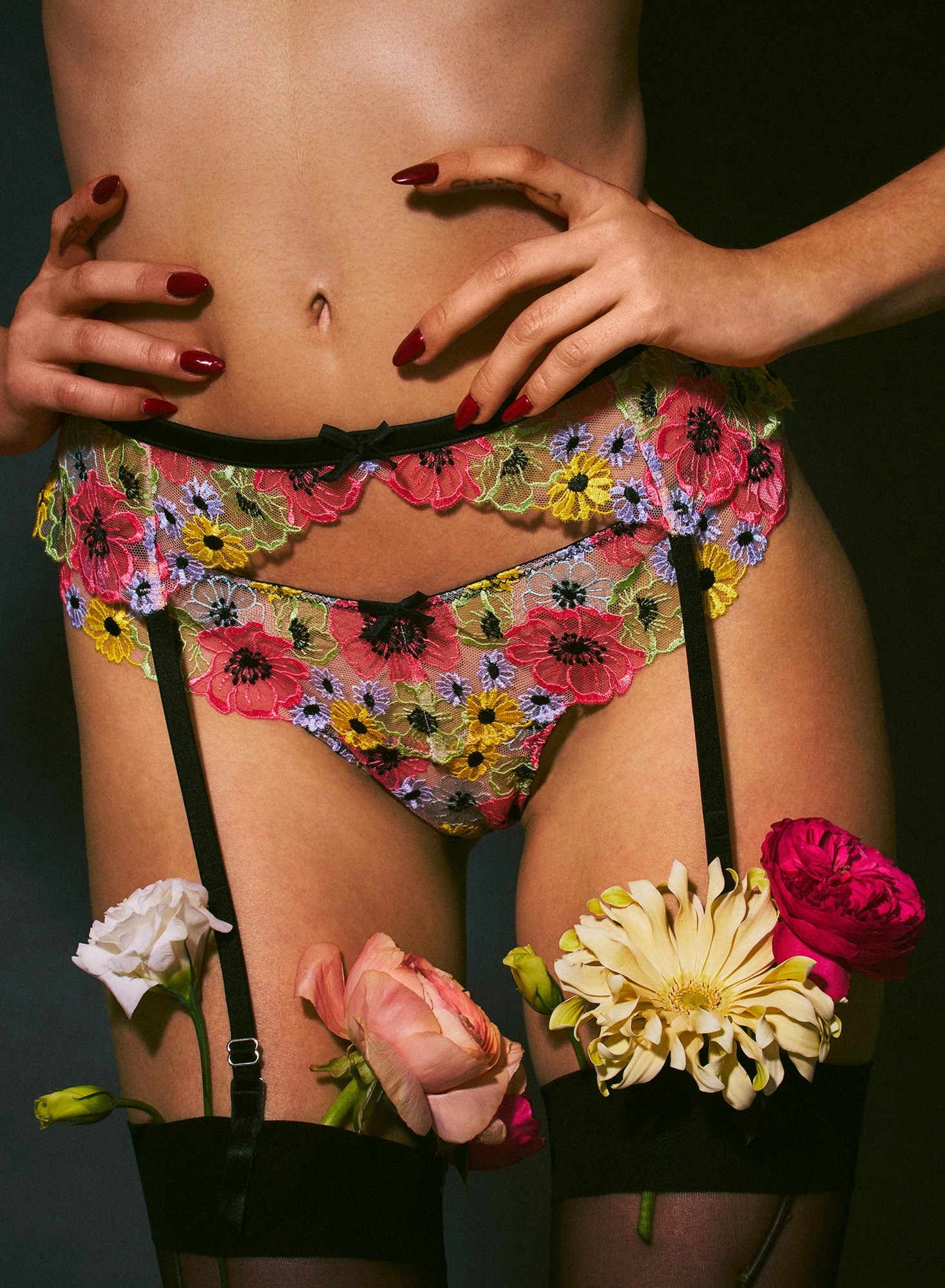 Our Azalea Embroidery Thong, featuring multicolor floral embroidery with stretch mesh back and playful keyhole detail. Complete the set with the matching Azalea Embroidery Bra & Garter Belt.
