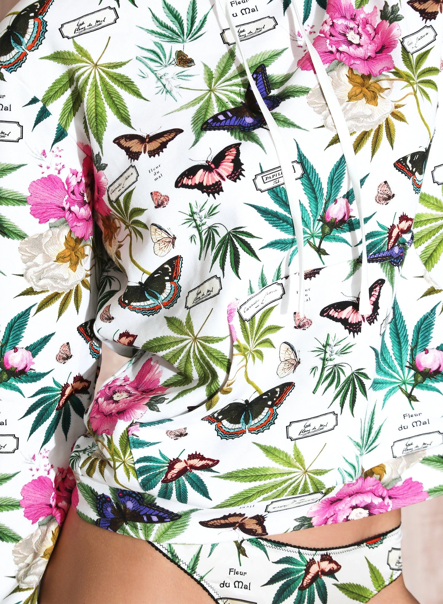 Make me sweat. Your favorite classic sweatshirt in our intoxicating Fleur Botanical papillon, Cannabis-inspired printed hoodie. Features drawstrings at neck and front pocket. Pair it with the matching Botanical Cheeky. Slightly oversized fit.