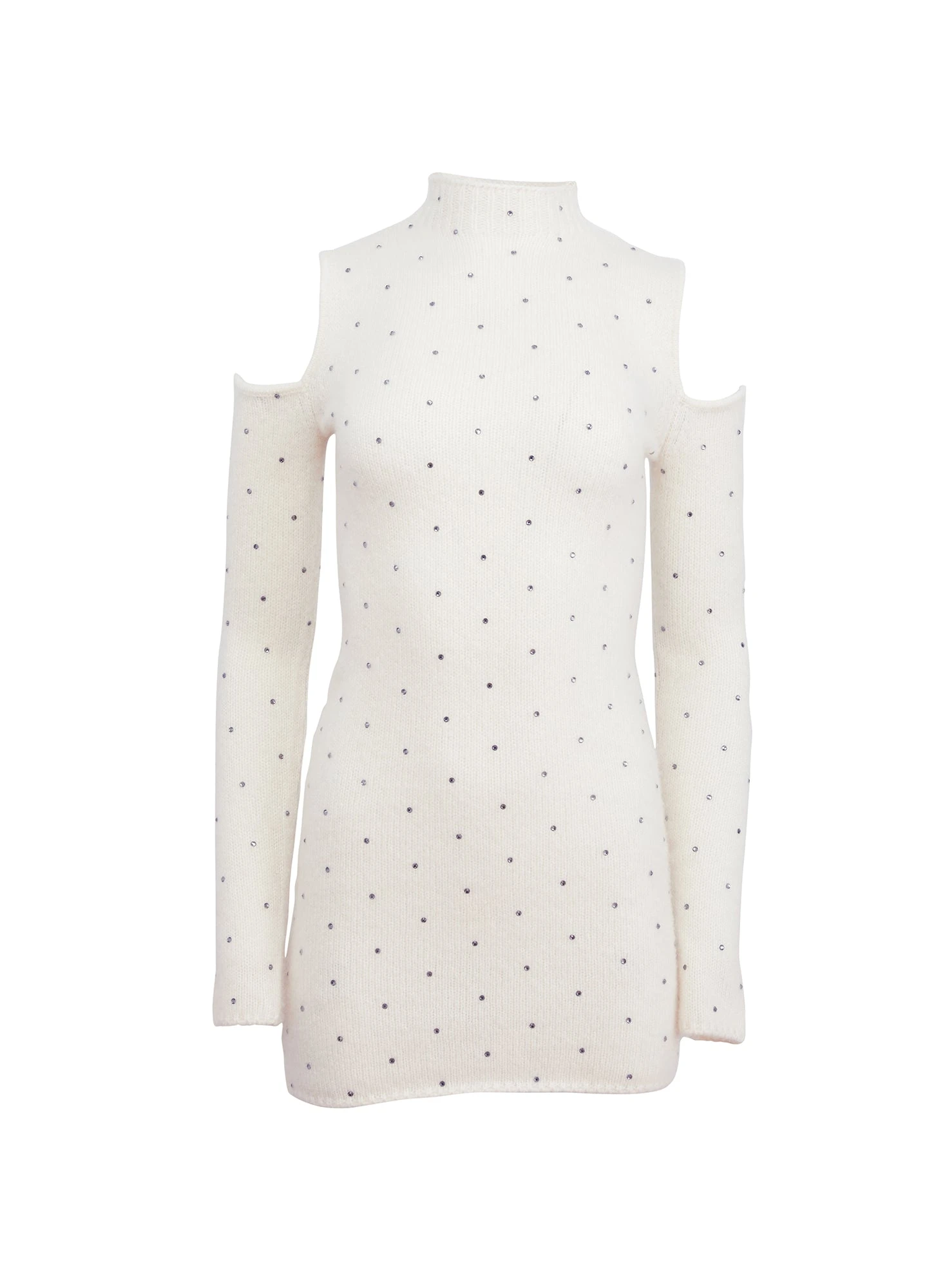 Give them the cold shoulder in our Cashmere Mini Dress. Cut from figure hugging, super soft cashmere in a sexy mini length. Features embedded charcoal rhinestones and long sleeves with cold shoulder cut out. Layer over your favorite Essentials panty for a chic look that will take you from happy hour to after hours.