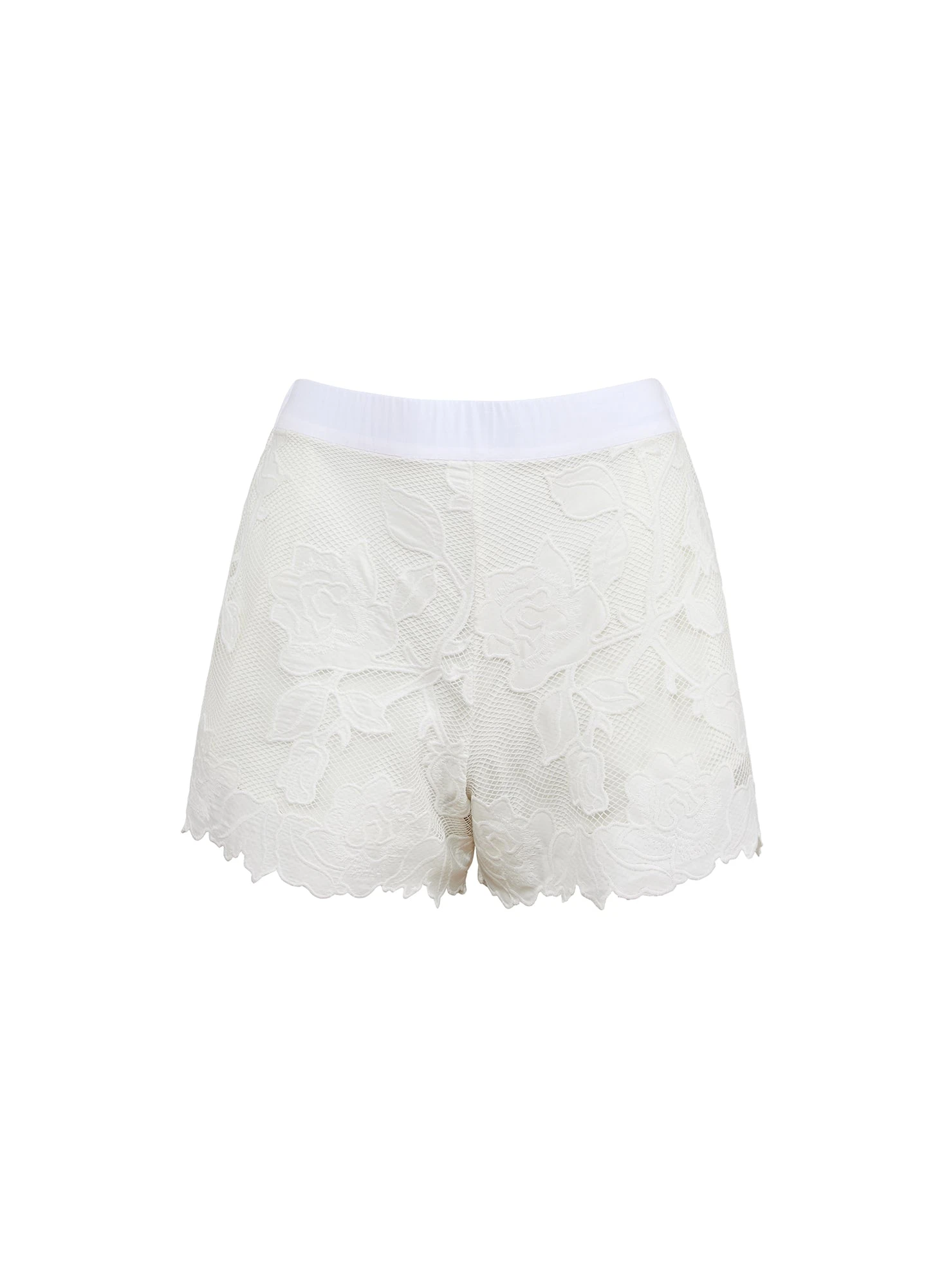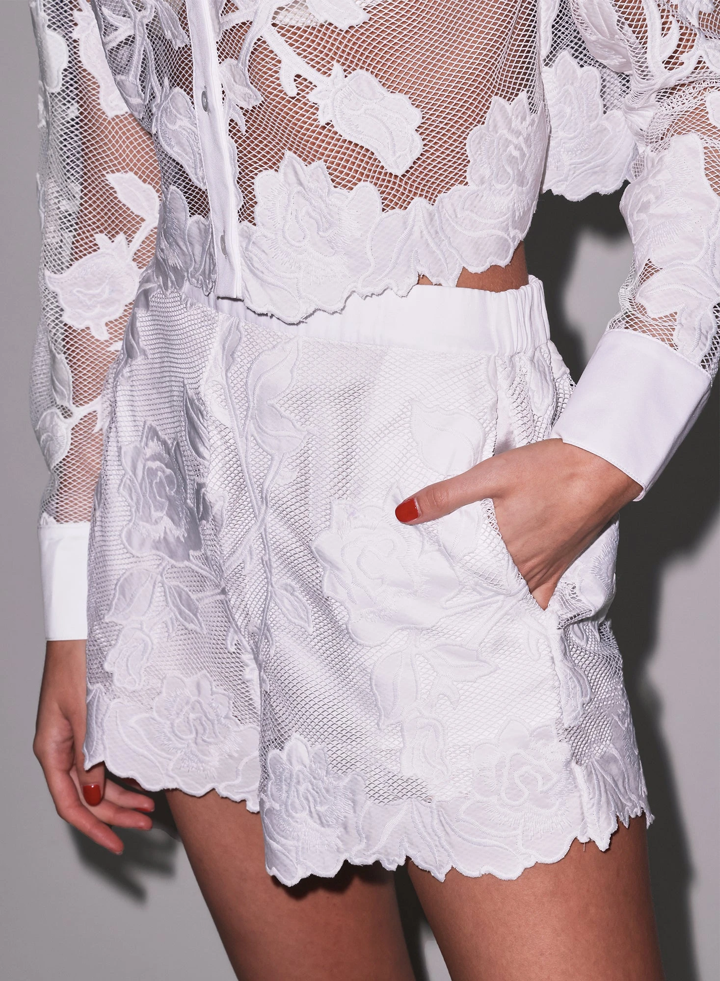 Our Collette Short, with custom floral embroidery and satin lining. Features front pockets, elastic waistband, and scalloped edges. Complete the set with the matching Collette Cropped Shirt.