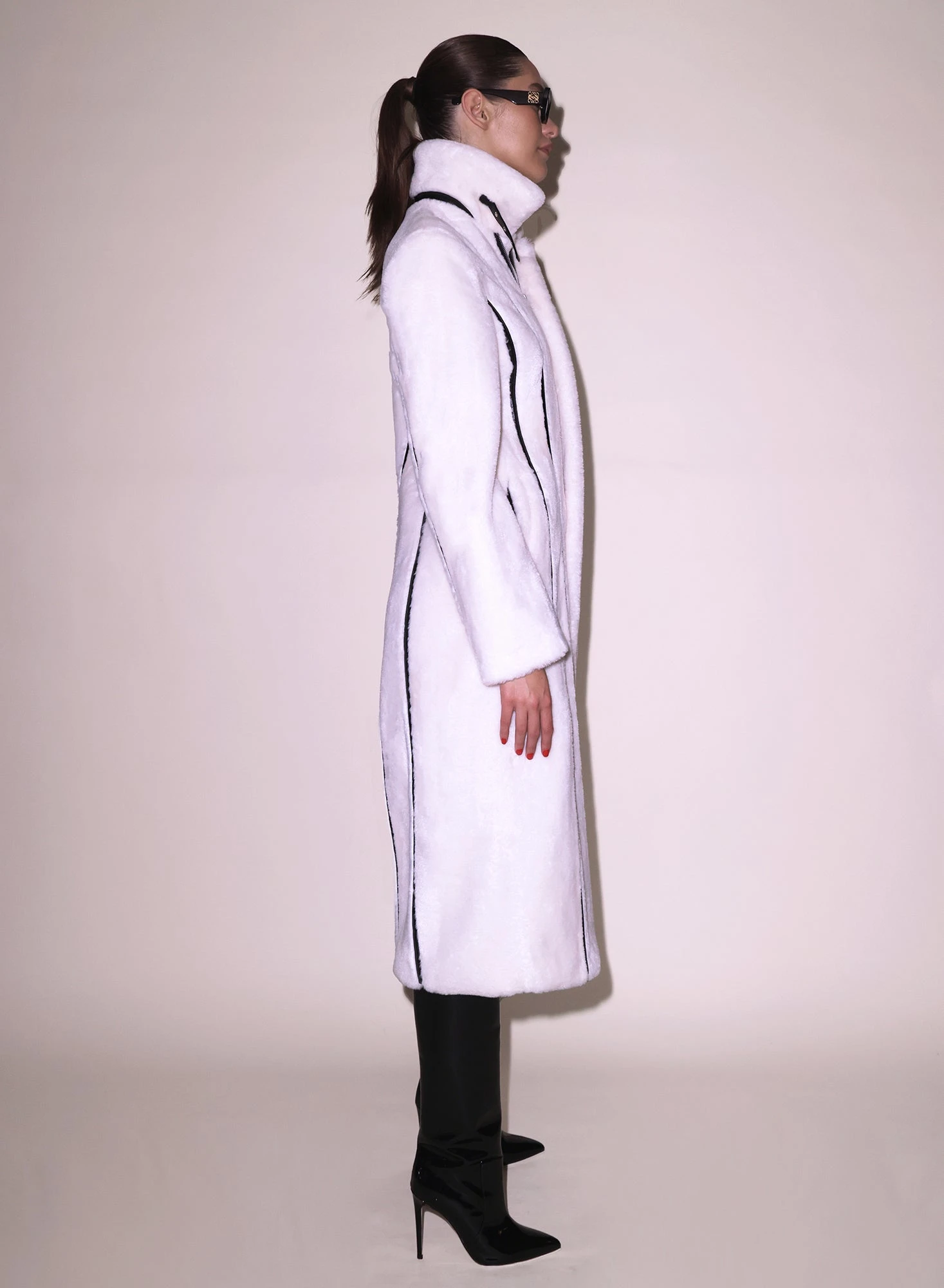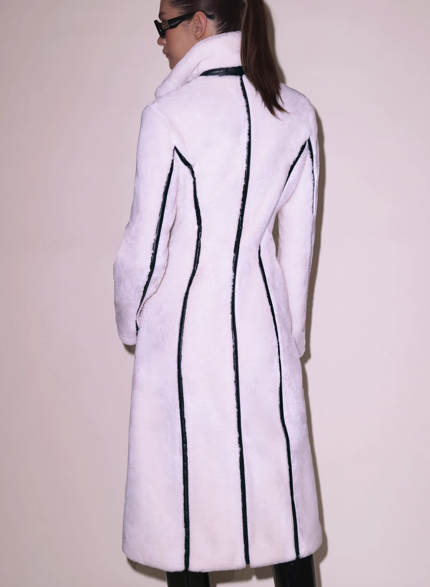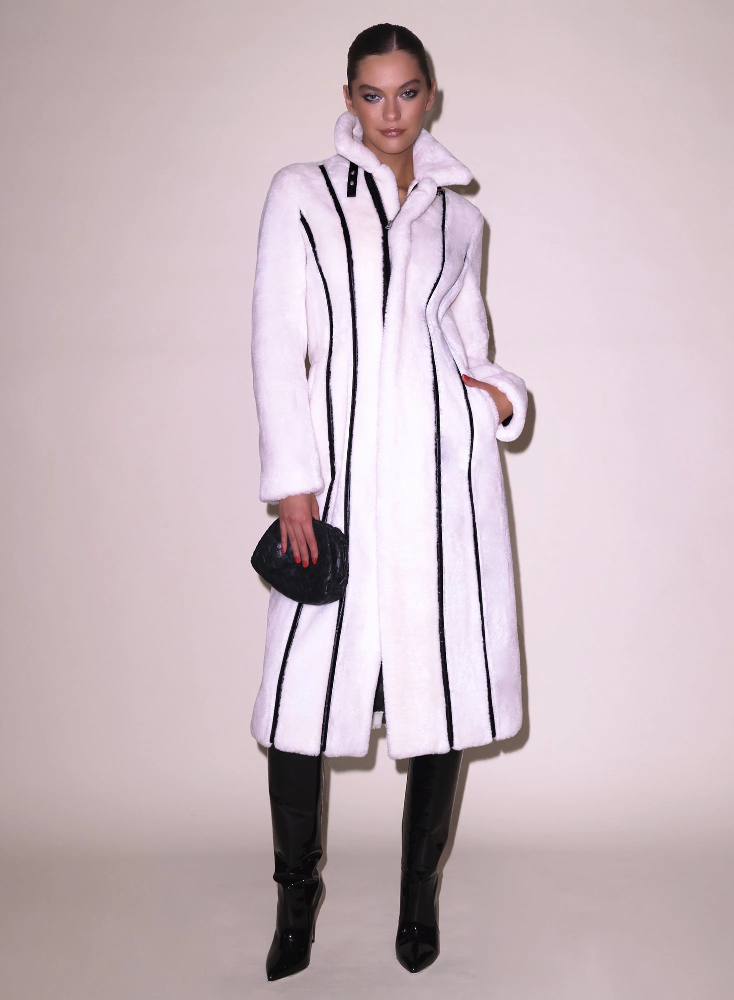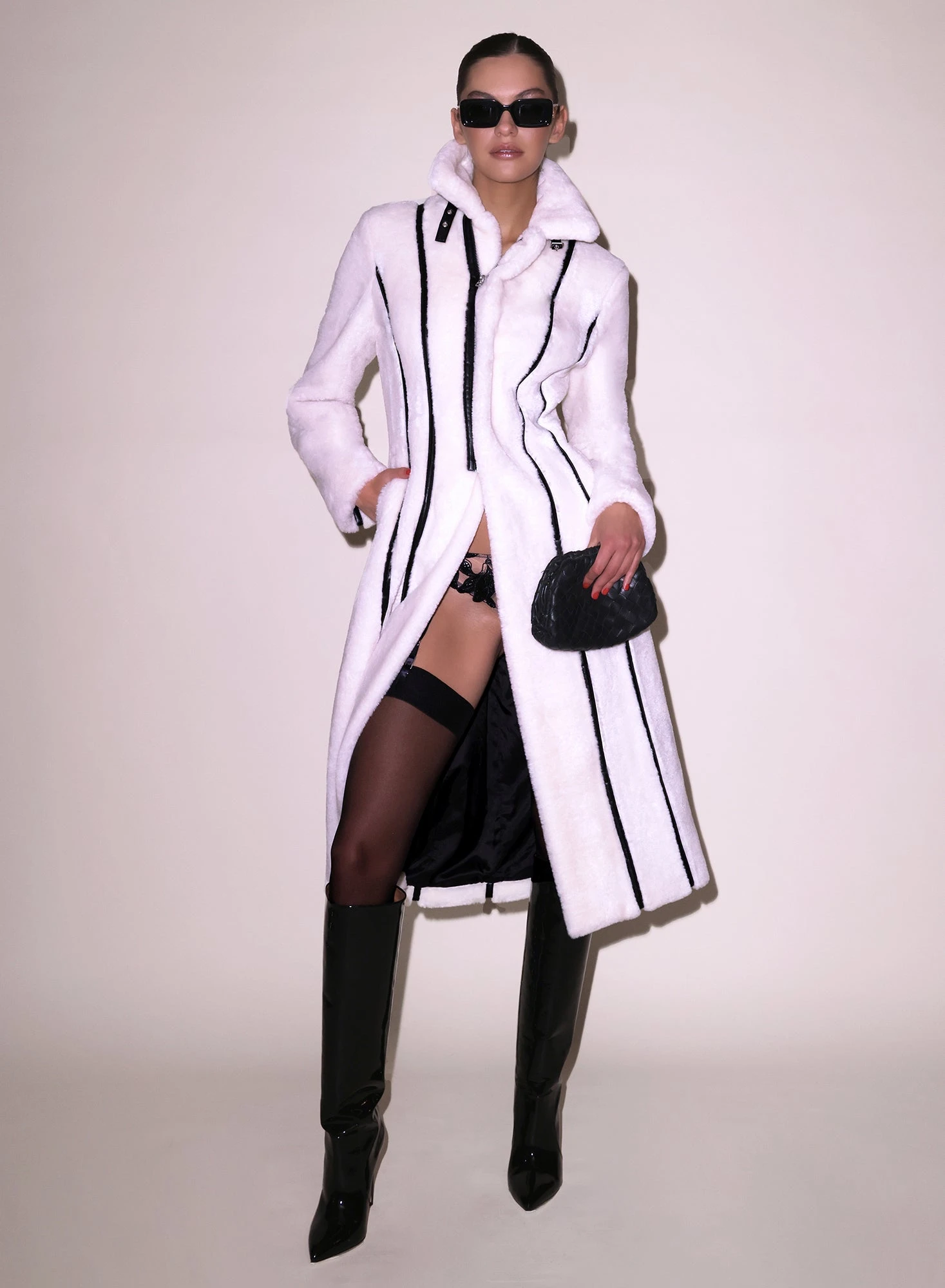 Faux real. The Diana Faux Shearling is an essential piece you will wear over everything (or nothing) this season. Features vegan leather piping down with tapered waist and ultra flattering hourglass shaping seams. Center front zip with adjustable belt closure at neck. Lined. Surprise someone late night with the Lily Embroidery Garter and Thong.