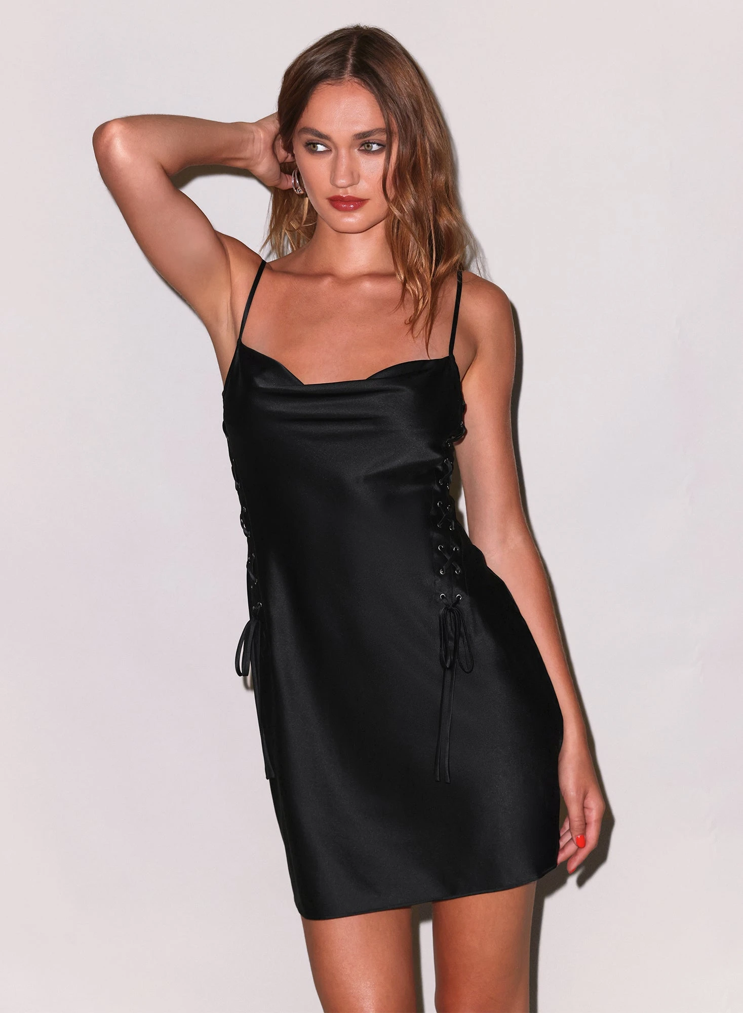 Our ultra chic Ella Mini Dress, cut from stretch silk charmeuse with cowl neckline and adjustable straps. Features adjustable lace up detail at side for added sex appeal. Invisible center back zipper. Layer over your favorite Essentials panty and be the best dressed guest at any party.