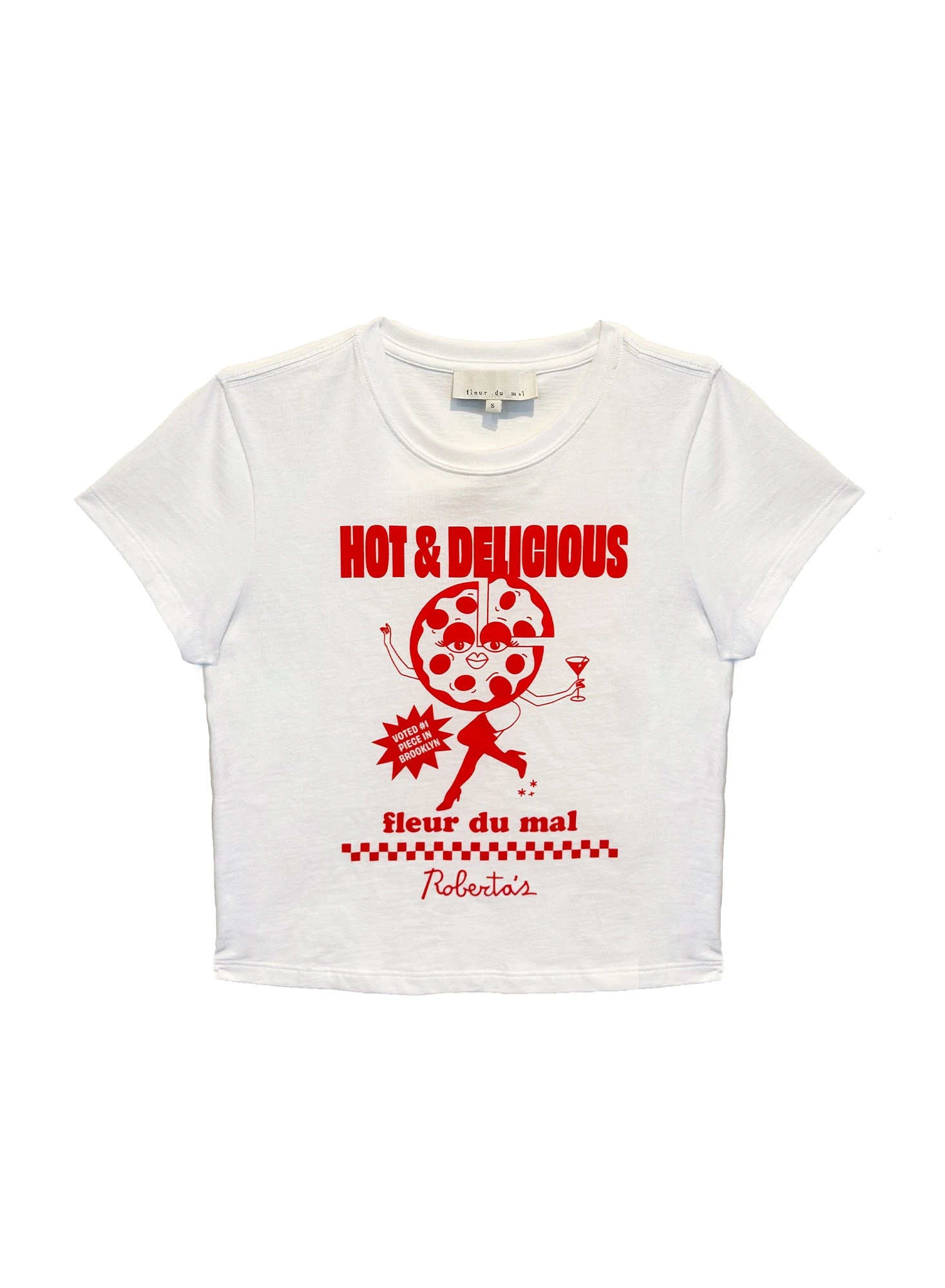 Our exclusive collaboration with Roberta’s pizzeria , Fleur X Roberta’s Baby Tee cut from 100% organic pima cotton. Ultra comfy white crew neck t-shirt with custom lettering. Relaxed fit. Looks chic taken out with jeans, or lounging with the Luxe Flutter Panty.