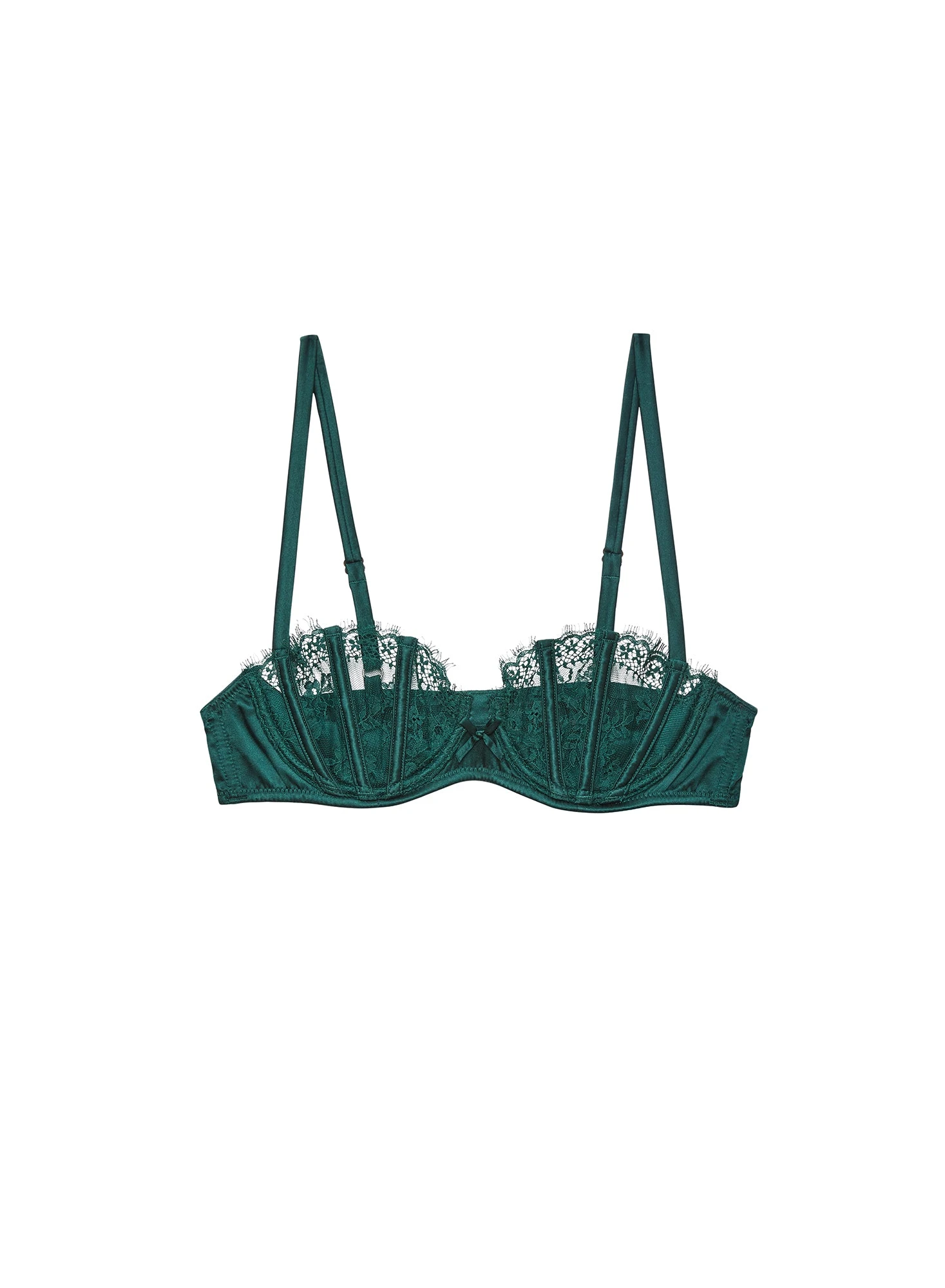 Our stunning Frankie Lace Boned Balconette Bra, featuring delicate French leavers lace cups with silk boning. Silk sling at bottom cup with light foam lining provides subtle lift and shape. Fully adjustable straps with back hook and eye closure for a customized fit. Complete this intoxicating bedroom set with the matching Frankie Lace V-String and Garter.