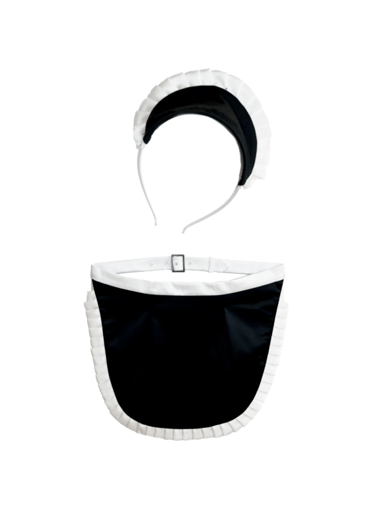 Maid to please. Our French maid set includes a black silk headband and apron with white ruffle trim. Apron features an adjustable buckle closure. Pair with the Charlotte Halter Teddy and Feather Tickler.