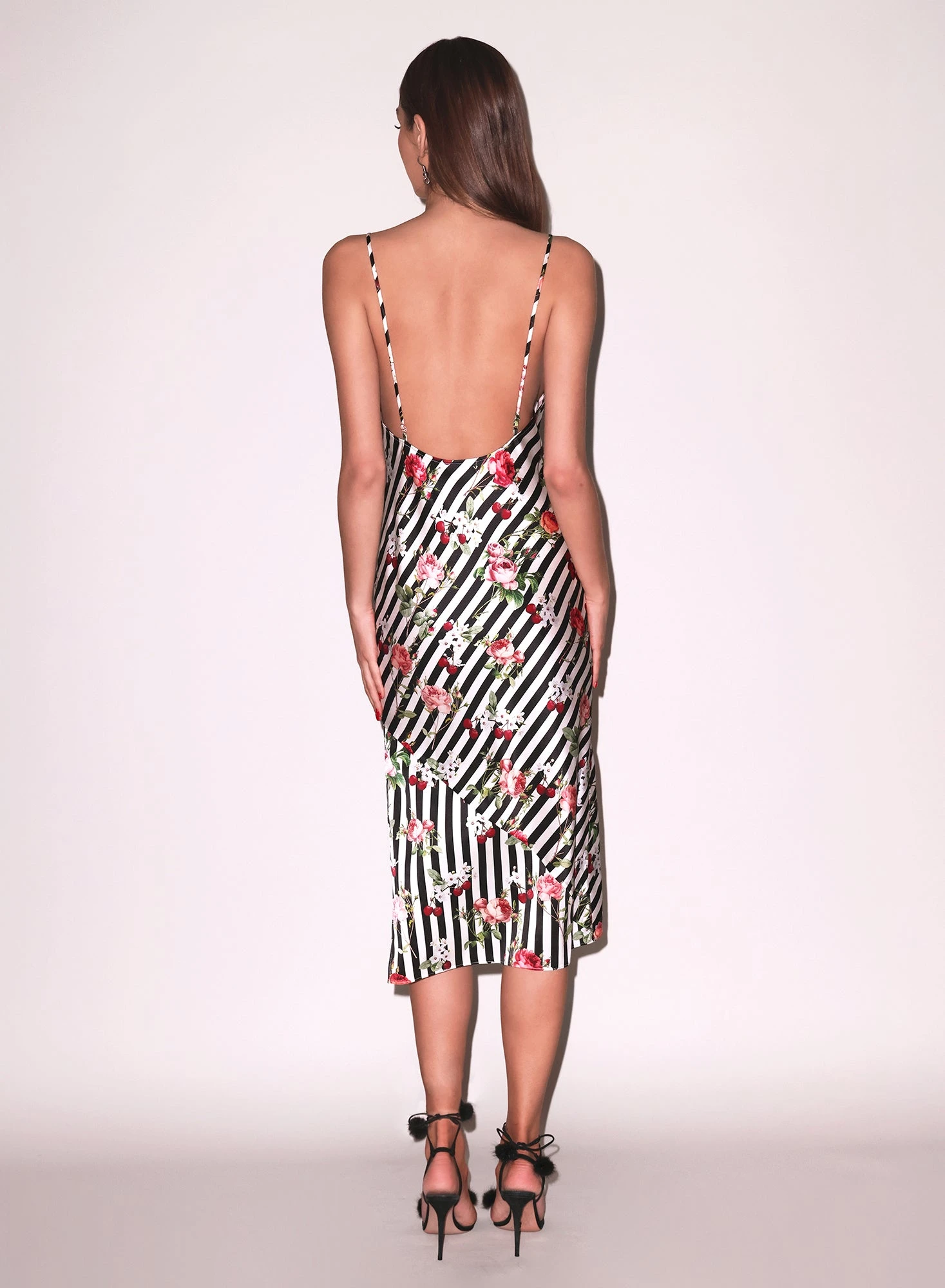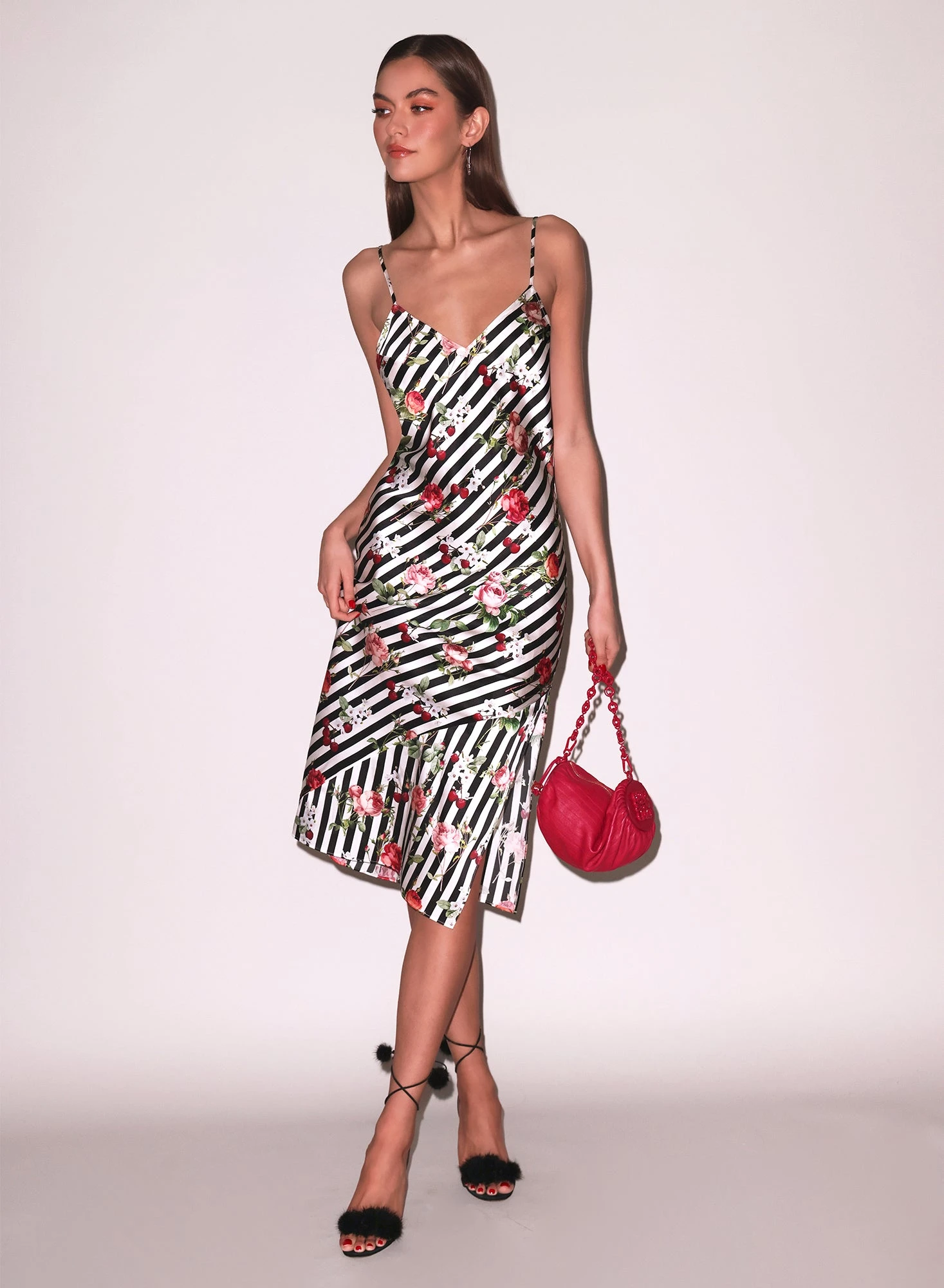 Our Giselle Rose Slip, cut from bias cut silk charmeuse with striped rose and cherry print. Features flattering v-neckline with side slit and adjustable straps. Falls just below the knee. Layer over your favorite Essentials panty for a seamless look.