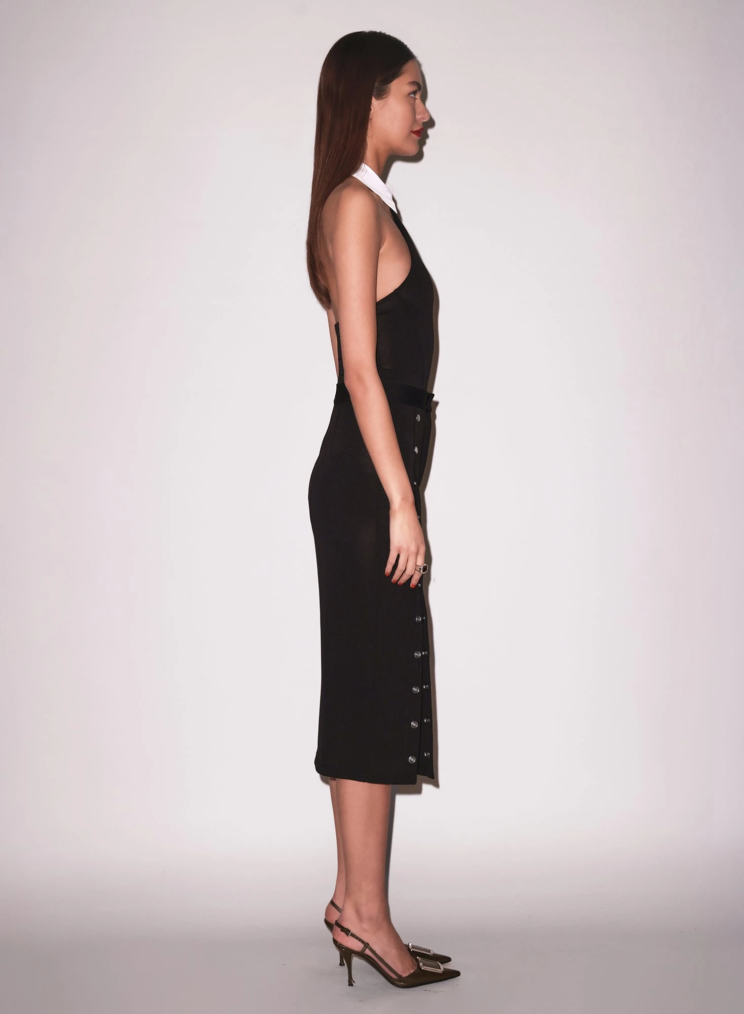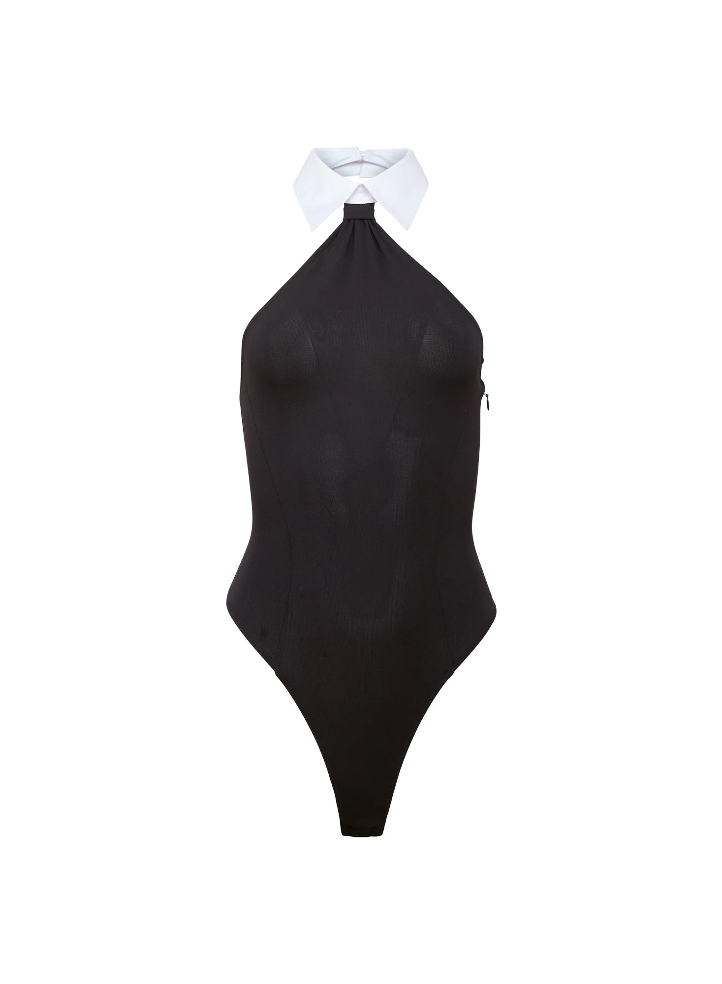 Hot under the collar. Our Hannah Bodysuit, cut from matte jersey with poplin collar and necktie detail. Hook and eye closure at collar, with bottom snaps and thong cut. Looks chic with Undo Me Skirt.