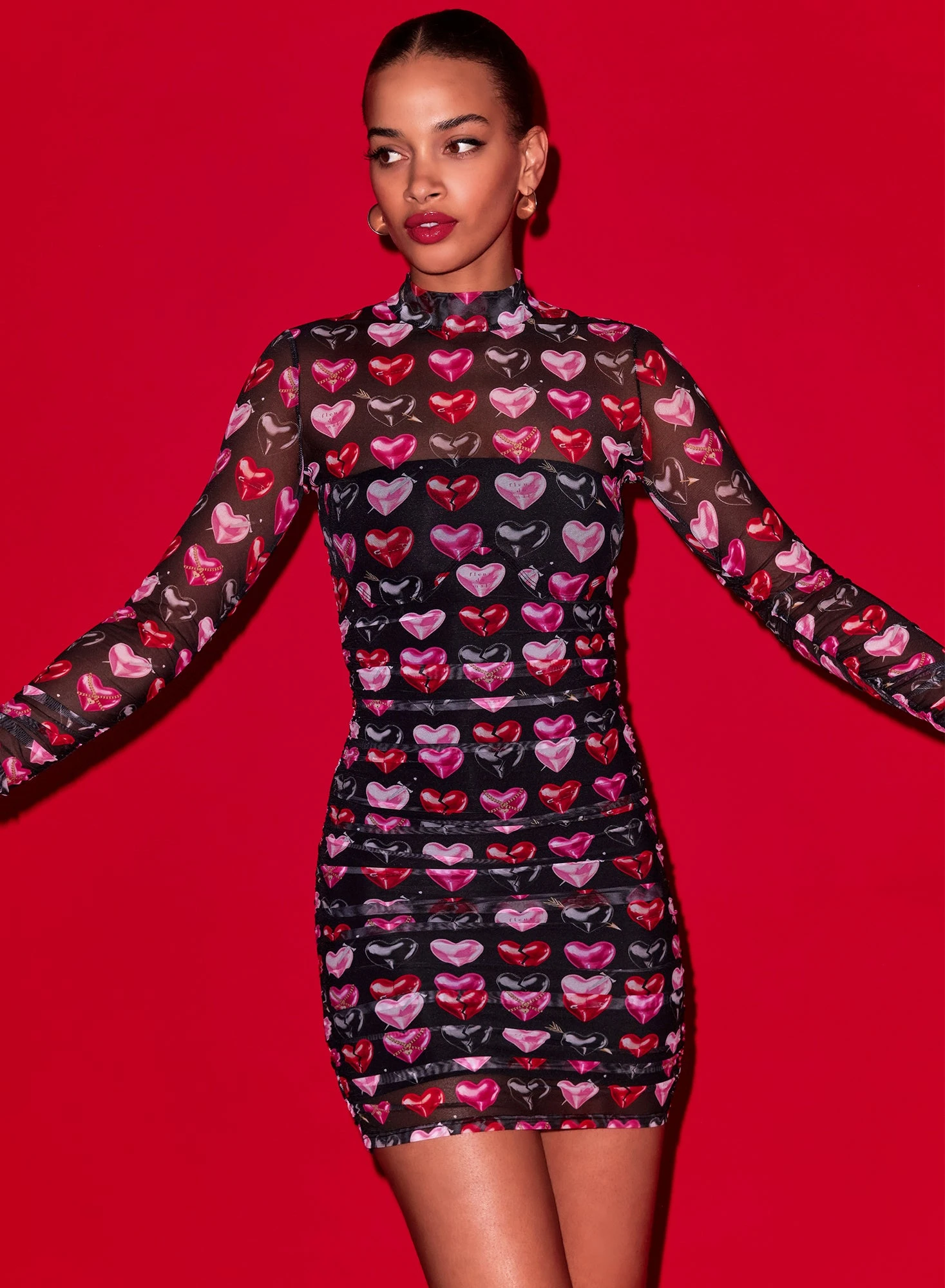 Our Heartbreaker Ruched Mini Dress, cut from soft and breathable mesh that hugs your body in all the right places. Mini length with bandeau jersey lining and invisible zip closure. Take it out with the Luxe V String.