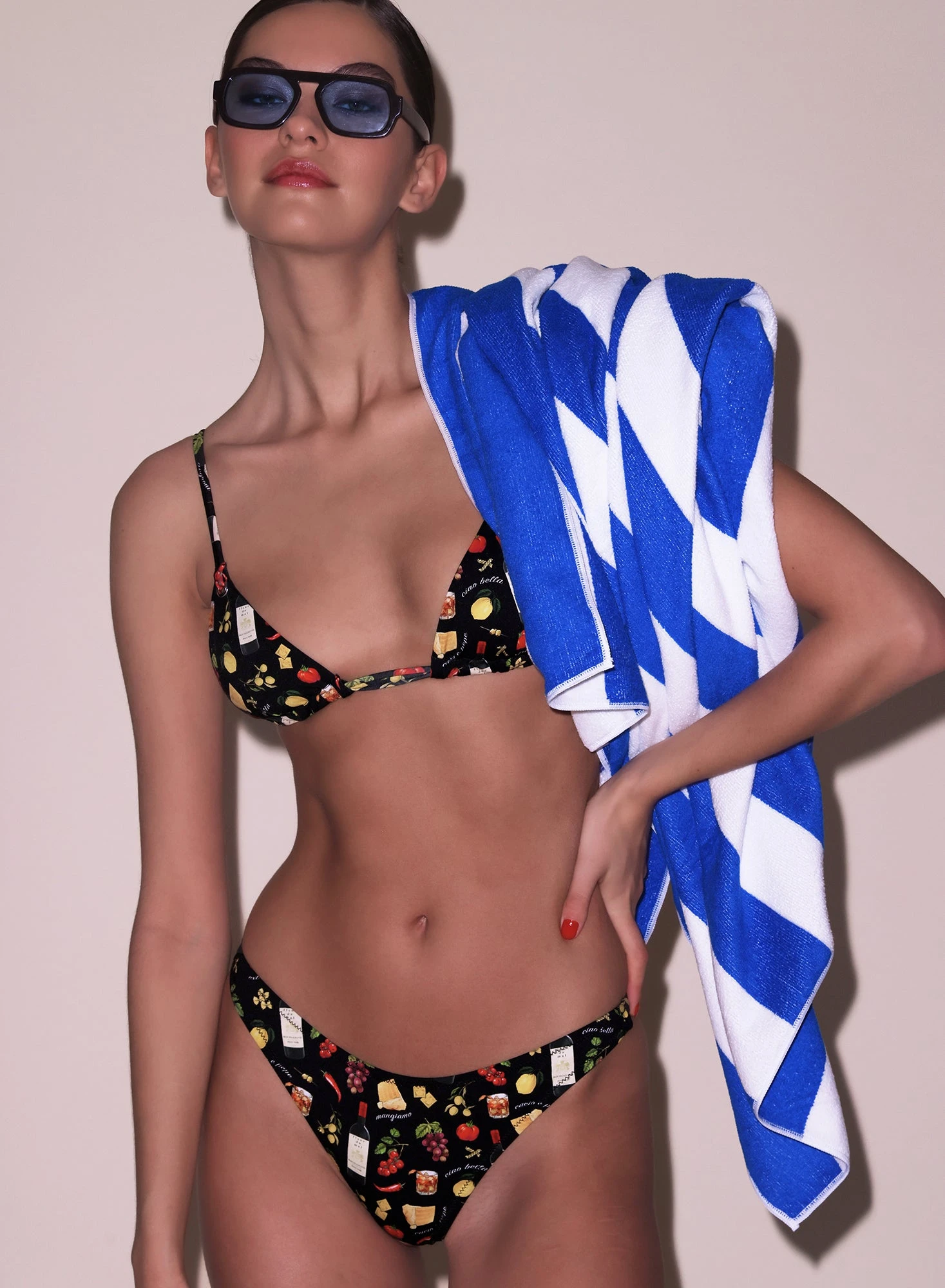 Adult swim. Our High Leg Bikini Bottom, illustrated with hand drawn Italian inspired motif. Cut from Italian stretch fabric that hugs and shapes, with ultra flattering high leg cheeky cut. Fully lined. Complete the set with the matching Grommet Triangle Bikini Top.