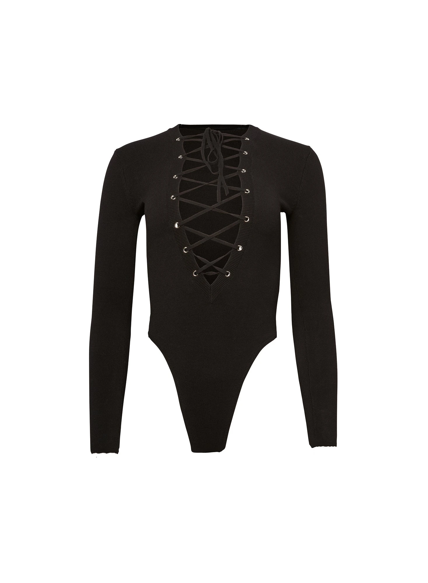 Touch my body. Soft knit long sleeve bodysuit with plunge front. Completely adjustable lace up detail with grommets to show as little – or as much – as you want. Thong style bottom, snap button closure. Looks chic with your favorite pair of boyfriend jeans.