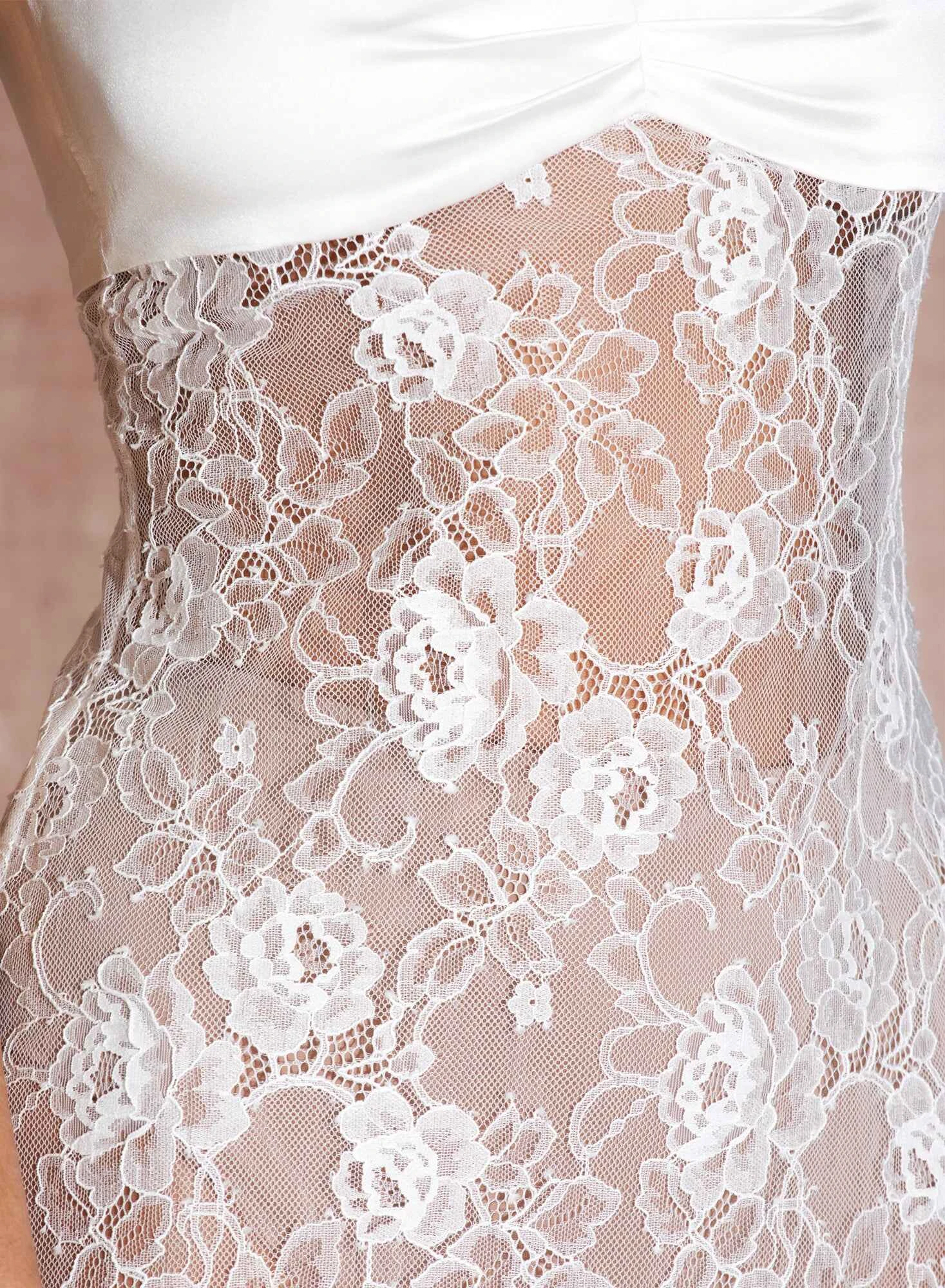White hot. Our Lace Bralette Dress, cut from sheer lace with luxe silk bra-style top for added coverage and shape. Adjustable straps and cutout back detail. Midi length falls just below the knee. Take it out with the Luxe High Waist Panty.