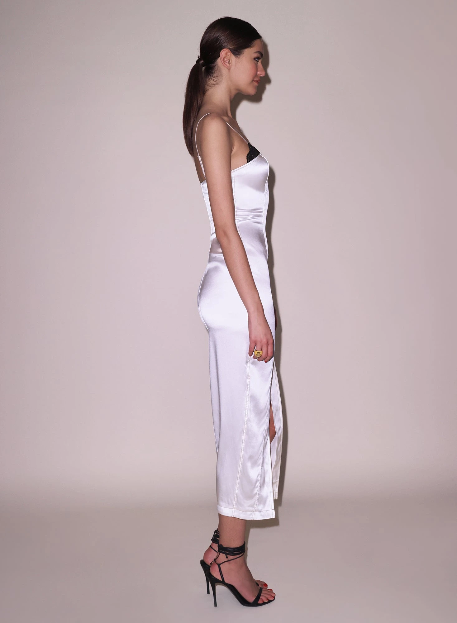 Our ultra chic Margaux Maxi Dress, cut from luxe silk charmeuse with peekaboo lace trim and top stitch detailing. Features adjustable straps and front slit. Invisible side zip closure. Take it from happy hour to after hours with your favorite Essentials panty.