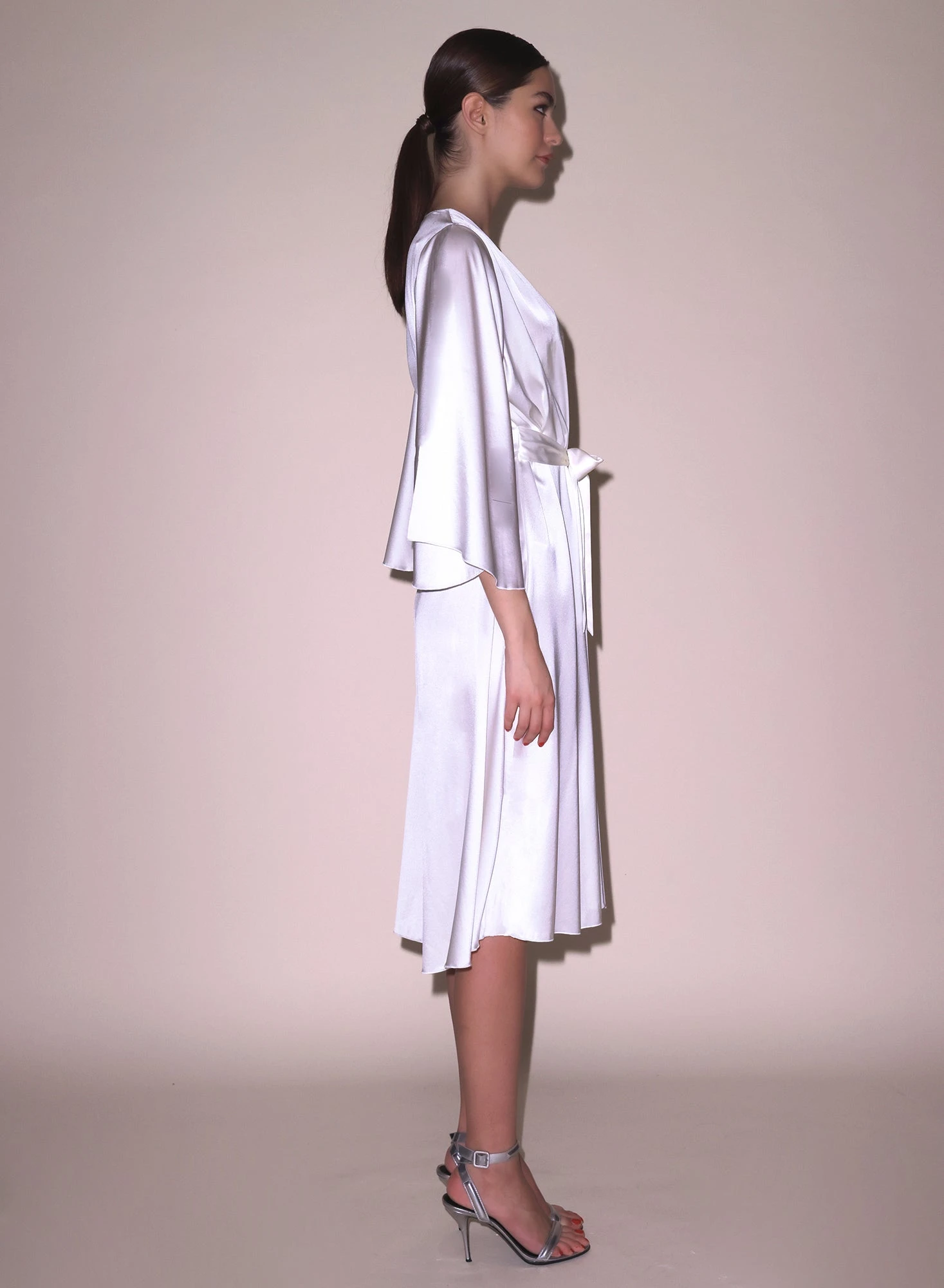 Our best selling Angel Sleeve Robe, now in midi length. Cut from luxe silk charmeuse, with a playful fit and wide sleeves. Wraps across the body and is secured by a sash. Pair with the Frankie Lace Boned Balconette Bra and Thong for an immaculate set.Â