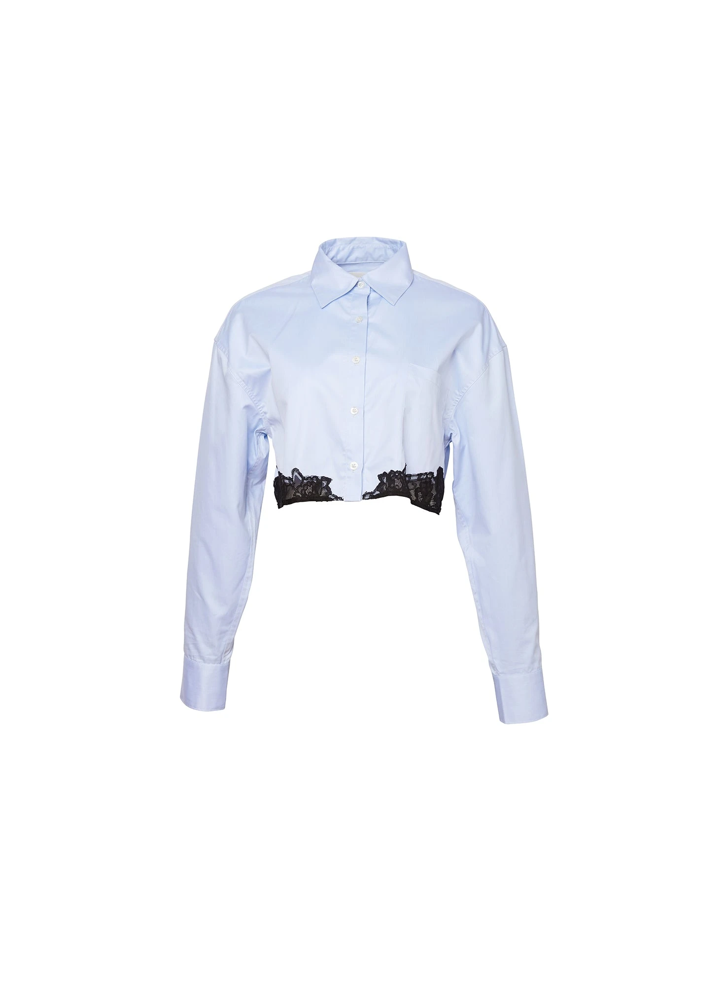 Lightweight European cotton Poplin Cropped Button Down with handcut lace detail at sides. Features a loose, comfortable fit. Pair with the Cage Luxe Triangle Bra and matching Poplin Boxer Short.
