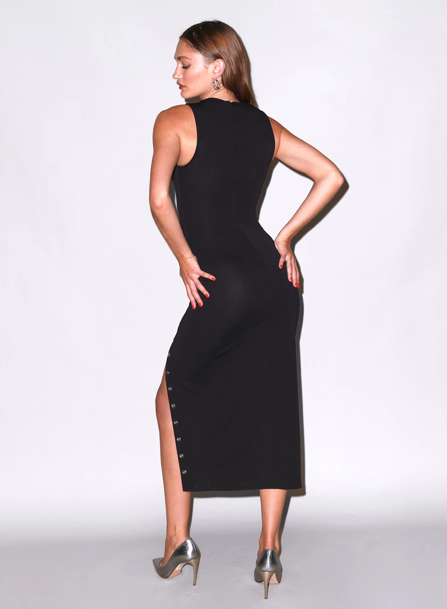 Keep things buttoned up or come undone in our sleeveless Scooped Undo Me Dress. Luxe jersey hugs your body in all the right places, with silver snap buttons to show as little or as much leg as you want. Midi length, back zipper closure. Layer over your favorite Essentials panty for a chic look that will take you from happy hour to after hours.
