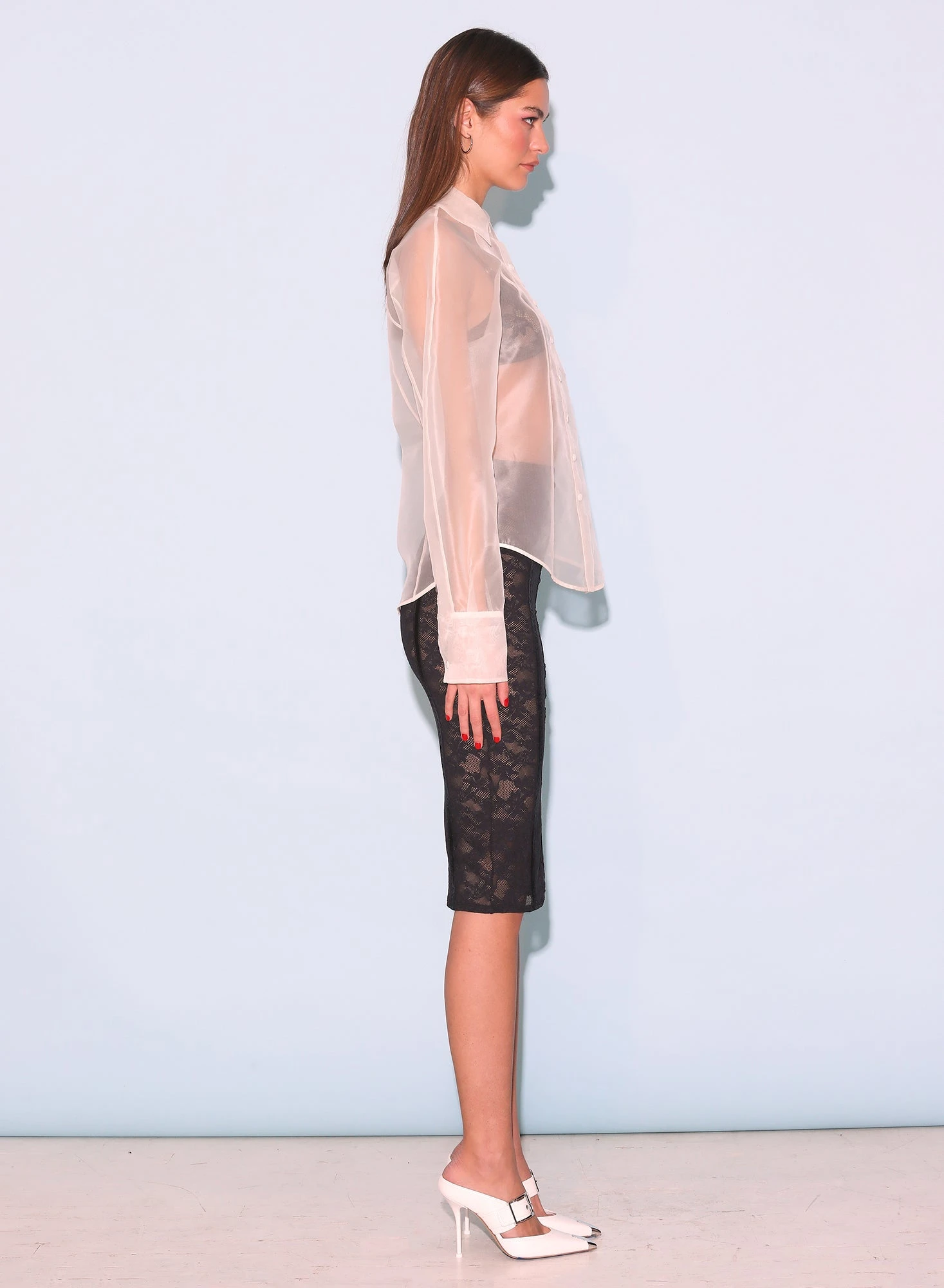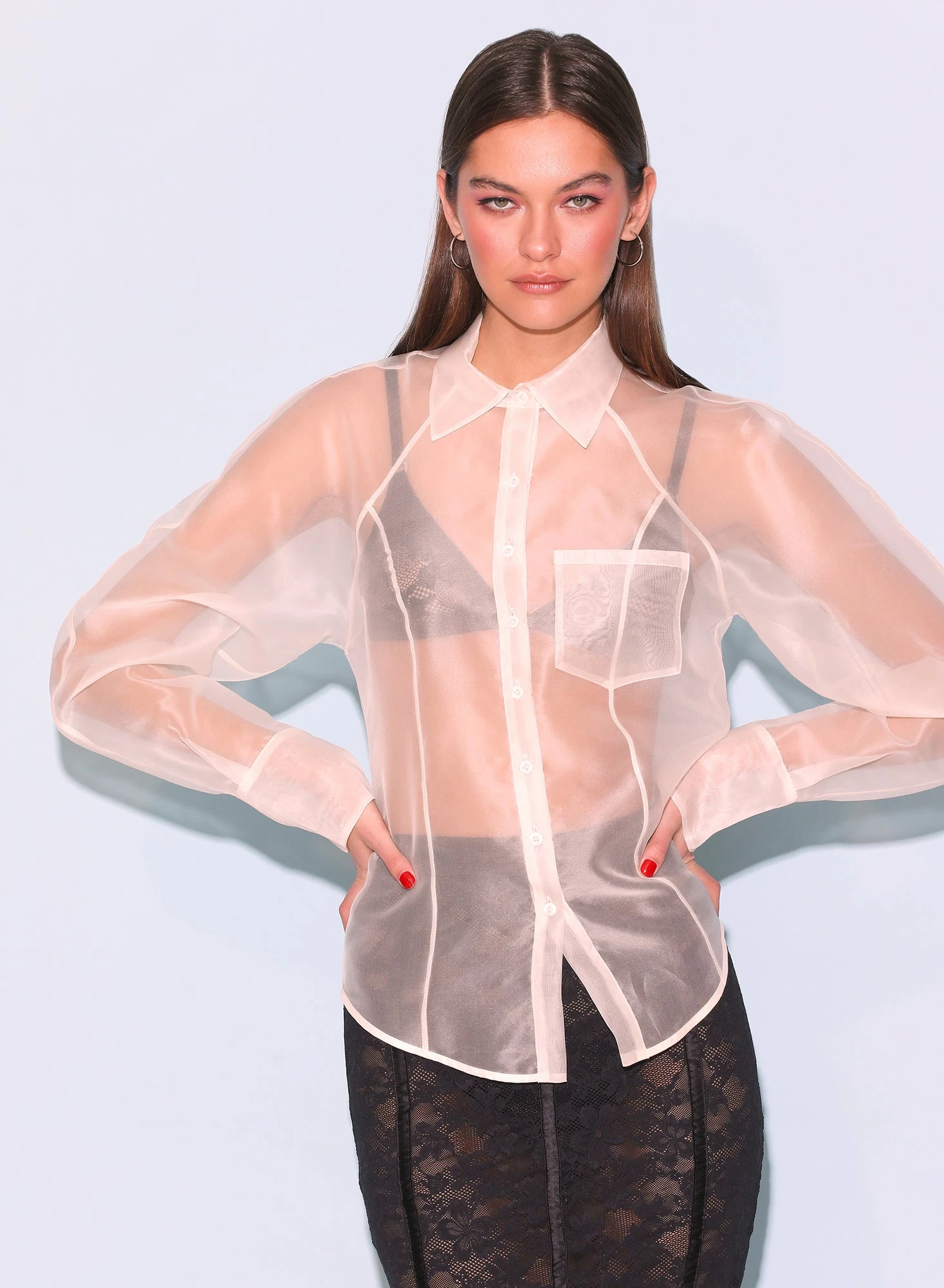 Sheer genius. Sheer silk organza button down top with puff sleeve. Take it out with the Le Stretch Lace Demi Bra and Pencil Skirt.