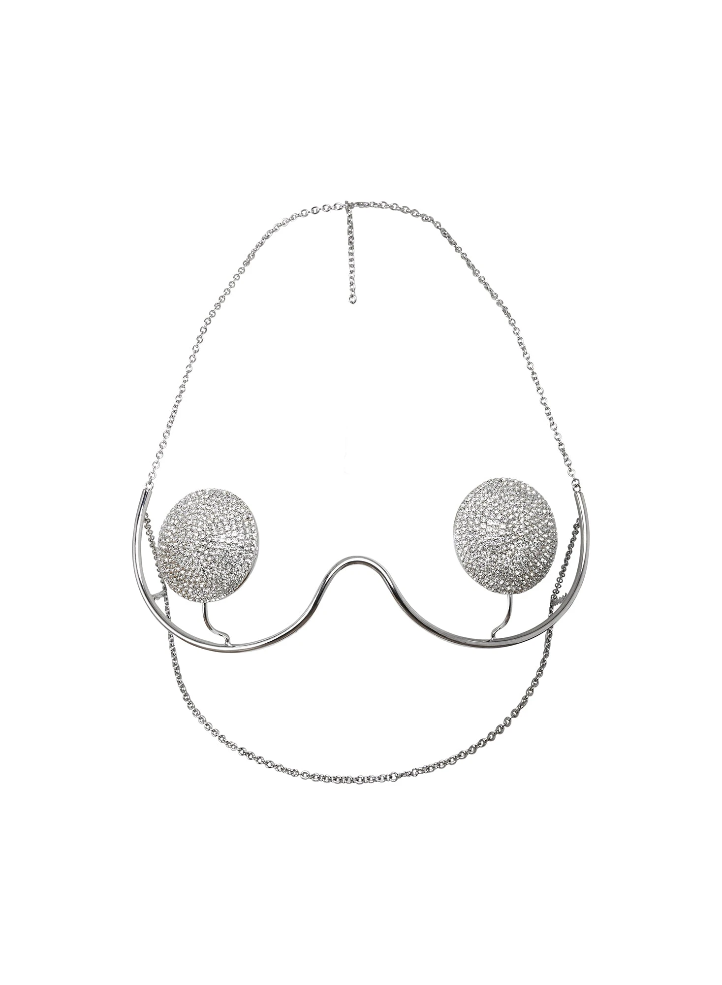 Our exclusive Underbust Crystal Bralette, made to contour the body with stunning crystal embellishment. Adjustable chain halter & back strap. The wire and bar to nipple covers are slightly bendable to wearer’s needs. Take it out layered under a button down, or pair with Lily Embroidery Ouvert Panty for an unforgettable after dark look.